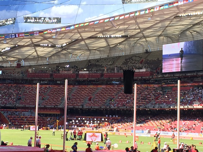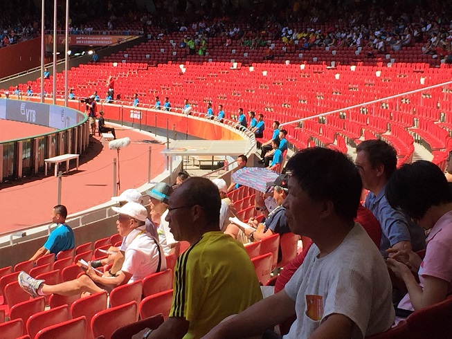 29日は決勝が目白押し!フィールドは女子走り高跳びと男子円盤投げです。円盤投げはちょっと地味で…。一方、走り高跳びは盛り上がりました。選手はみんなキレイだし、跳べた後のしぐさが可愛らしい。ロシアの3選手が国旗をまとってウィニングラン!スタジアムのどのコーナーでもすごい声援です。さすが決勝は盛り上ります。22日は予選ばかりでチケットは100元、29日は決勝ばかりで300元。