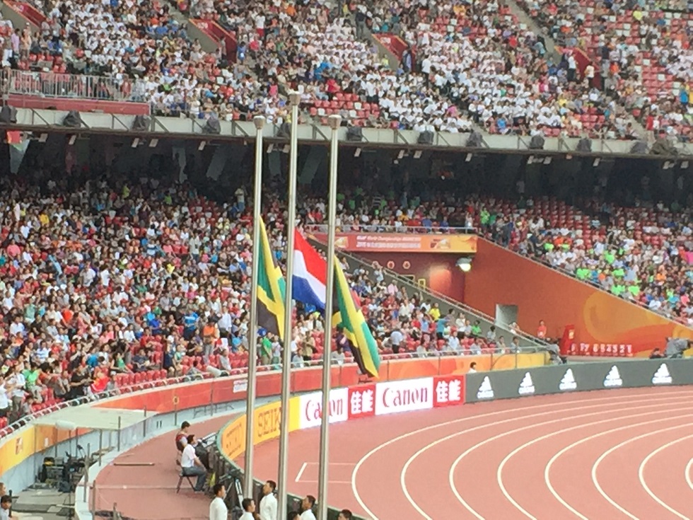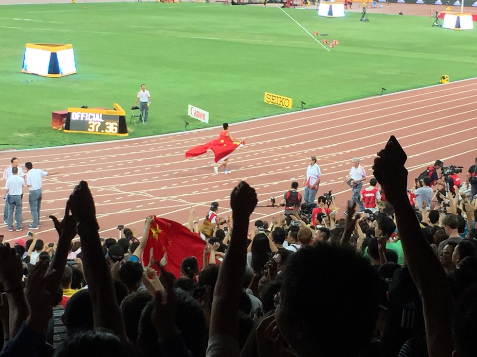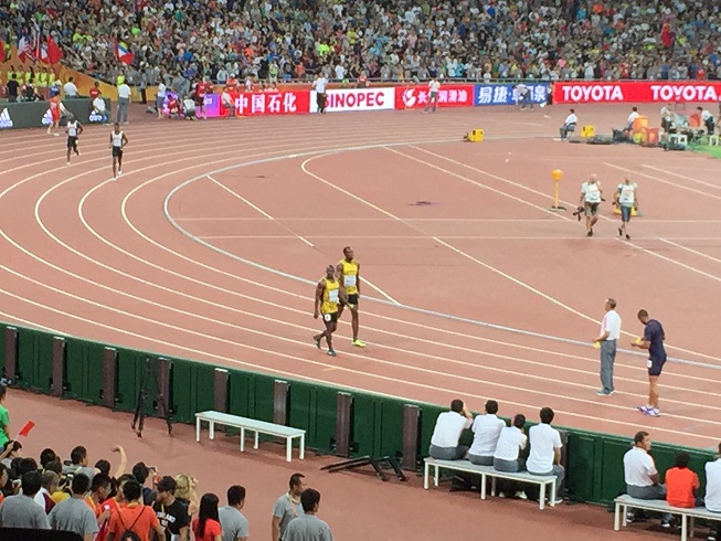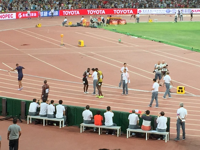北京でもボルトはスゴイ人気!なにせ2008年の北京オリンピックのイメージが強くあります。あの時のボルトはすごかった。私もですが、あの印象が頭にしっかり刻まれています。決勝には中国チームも出るので、スタジアムは興奮状態。あちらこちらでウェーブやらエールやらが怒涛のように起こっています。会場内には”お静かに!”とのアナウンスが…。全員が立ち上がっていて、もちろん私も立ち上がっているのに全然前が見えない!横の中国人の子供に倣って、イスの上に登ってスタンバイOK。レースはあっと言う間。中国チームがはやーい!びっくりするほど本当に速い!スタジアムはエライことになっています。