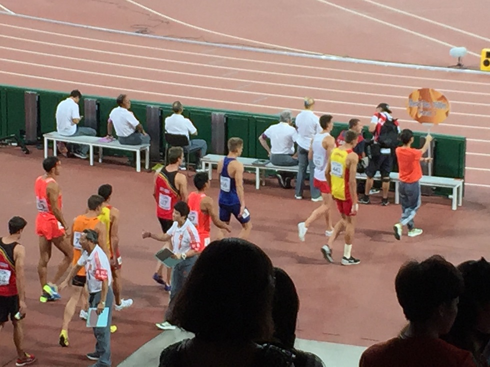 29日の午後は男子十種競技のやり投げと1500メートルがありました。日本の選手が決勝に残っていない中、十種競技で日本人選手が見られてよかった。この写真は最後の1500メートルの入場シーンです。日本選手のユニフォームはテレビ画面ではピンク色に見えていたのですが、会場でみるとオレンジ色。テレビの再現性ってやっぱり限界があるのね。或いは私の眼がおかしい?