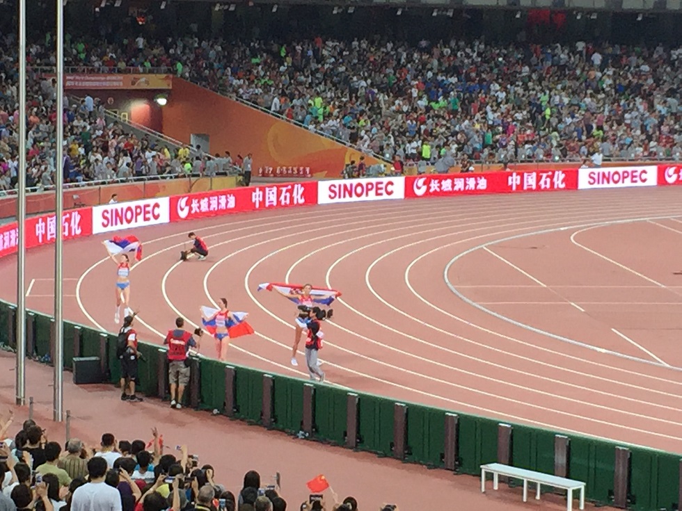 中国人選手が五星紅旗を身にまといトラックを走ります。みんな手を上げて大興奮!日本も決勝に残っていたらなぁ…。予選のバトンのミスが悔やまれます。