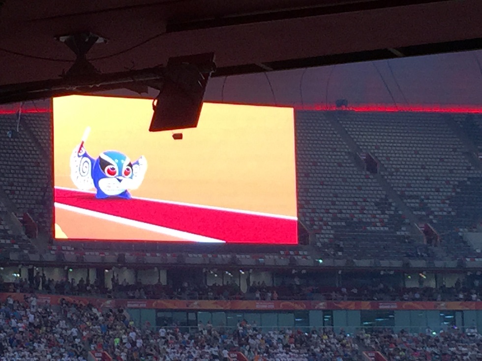 29日はいくつか表彰式もありました。メダルとキャラクターのぬいぐるみの授与の後、上から下まで白いぴっちりした服を着た見目麗しい中国人の男の子6人により国旗掲揚が始まります。国歌が流れ始めると、…観客全員が立ち上がって厳かに見守ります。うーん、日本が金メダルでもみんな立ち上がってくれるのかなぁ。