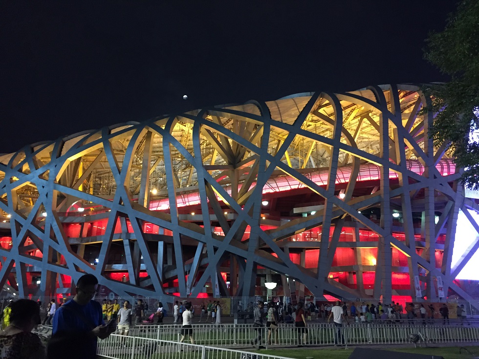 大興奮の後、会場を後にしました。地下鉄も混乱しているんじゃないかと、早々に出てくる人達が結構います。…振り返ると、鳥の巣が赤く浮かび上がってキレイ。上にはお月様。もう少ししたら中秋です。