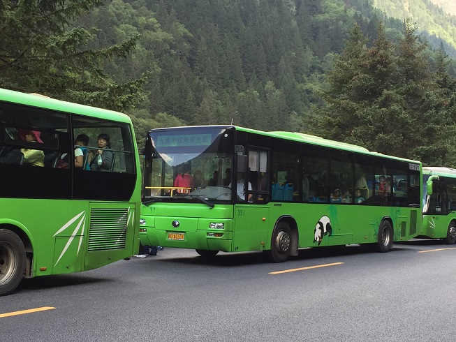 九寨溝はこういうバスがたくさん走っていて、スポットからスポットへの移動は歩くかこれを使うことになります。道がかなり蛇行しているのですが、バスは猛スピードで走ります。吊革につかまっていても身体がぐるんぐるん回ります。ここにもパンダ。笹の葉模様もついています。