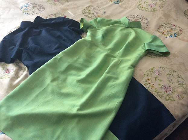 会社に着て行きたいんだけど…。紺色の方は大丈夫かな。髪の毛も先ほどショートボブにカットしてもらいました。1920-30年代の女学校の先生って感じ。緑色の方は、テラテラと黄色に光ったりしてかなり派手。…これは、着て行くところに迷う。上海で買ったシルクのハイヒールと合わせて、ちょっとしたパーティに…ぐらいかなぁ。…っでも、パーティがない!