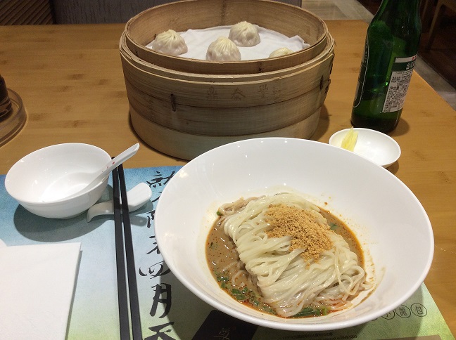 私のお目当ては鼎泰豊。お尻にカリフラワーが刺さっているケンタウルスの像の横にありました。店内は意外と広いです。お昼も食べていなかったし、お腹がすいていたので、さんざん迷った挙句、小龍包と担担麺と野菜炒めを注文。あと、台湾ビール!